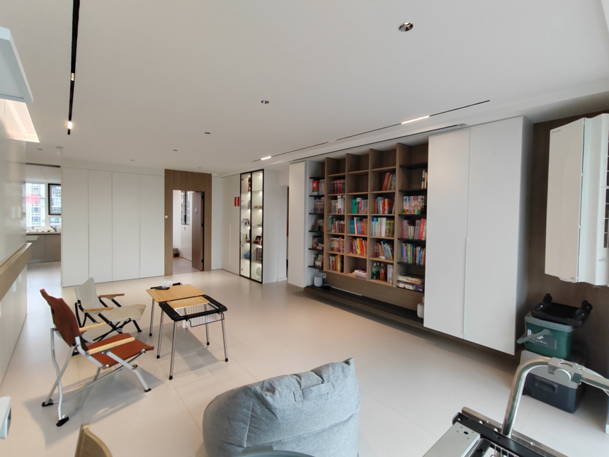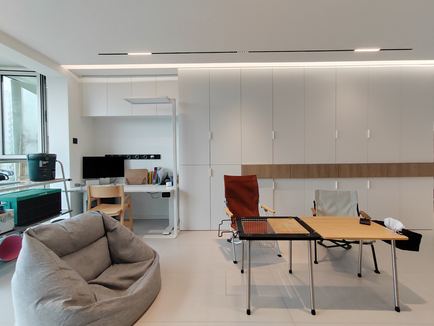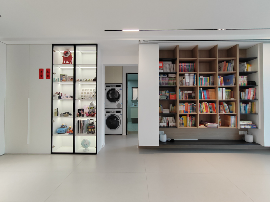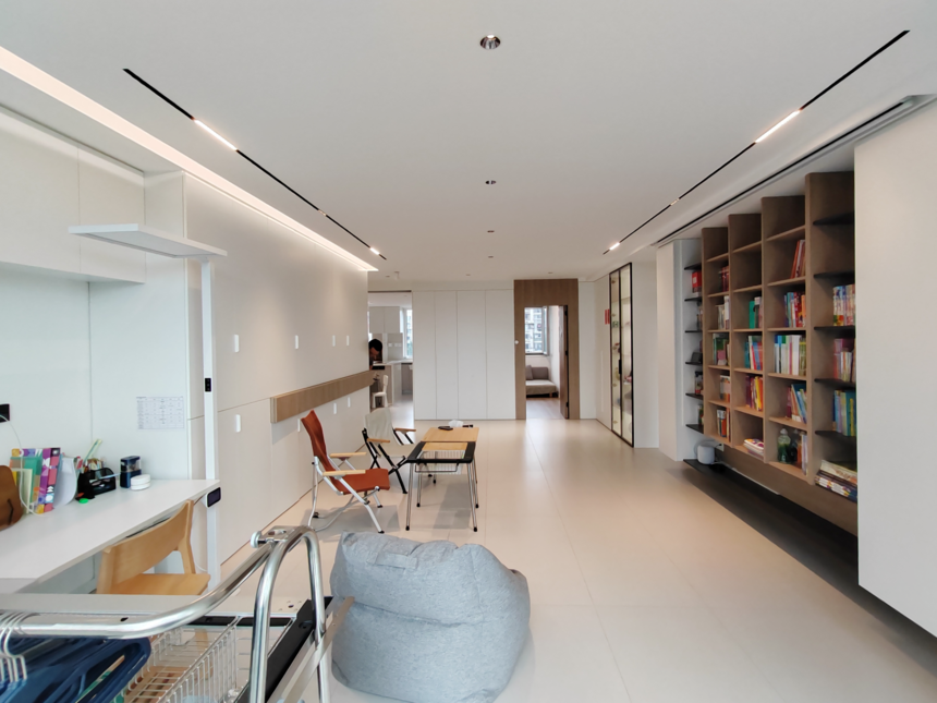 在客廳的設(shè)計(jì)中,拉滿(mǎn)儲(chǔ)物空間,格子柜容納業(yè)主書(shū)籍,無(wú)主燈設(shè)計(jì)使光線(xiàn)分散,不會(huì)晃眼。