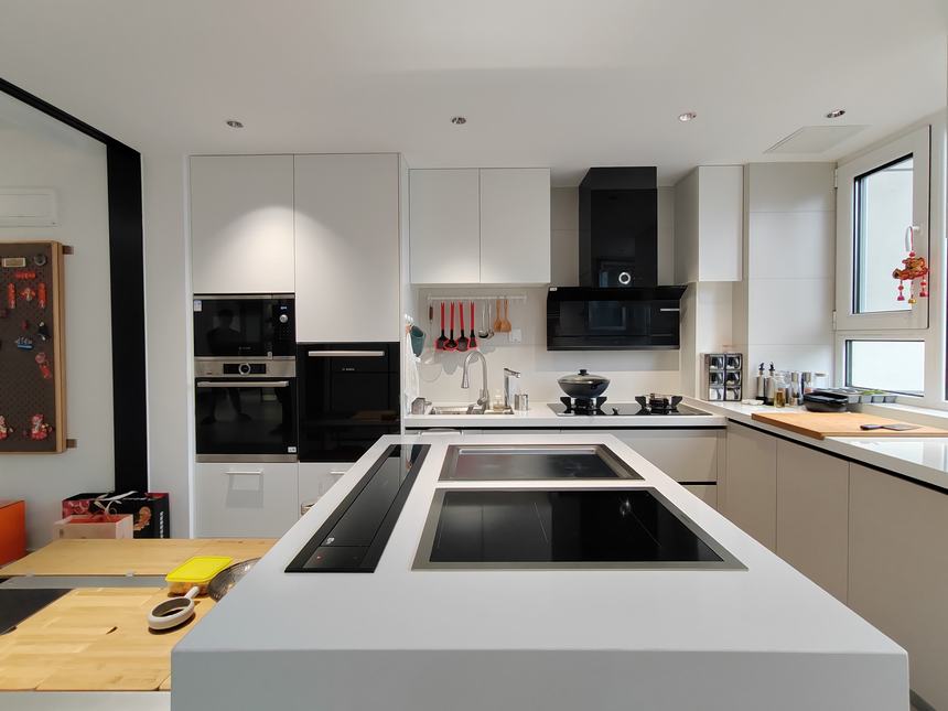 結(jié)合西廚、中廚的優(yōu)點(diǎn)打造猶如戶(hù)外的通透感。電器柜于電磁爐的綜合滿(mǎn)足業(yè)主的需求。提高空間利用率,擴(kuò)大廚房面積,充分利用空間