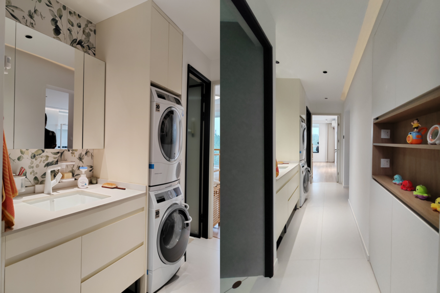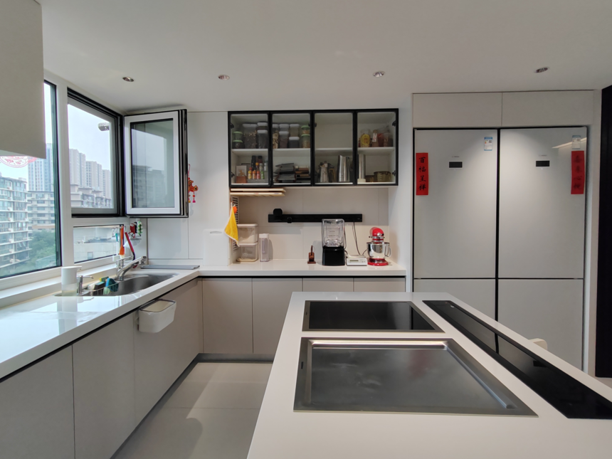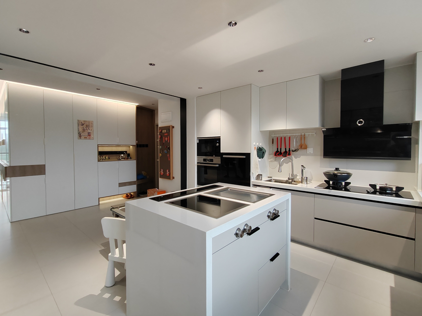 門(mén)廳與廚房利用柜體深度做口袋門(mén),抬高采光度,提升通透感。兩臺(tái)大匹力吸油煙機(jī),關(guān)上門(mén)隔絕油煙。儲(chǔ)藏空間做足,滿(mǎn)足家庭收納。