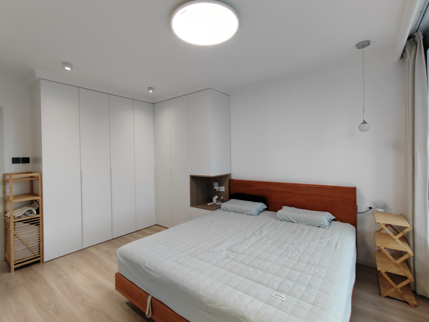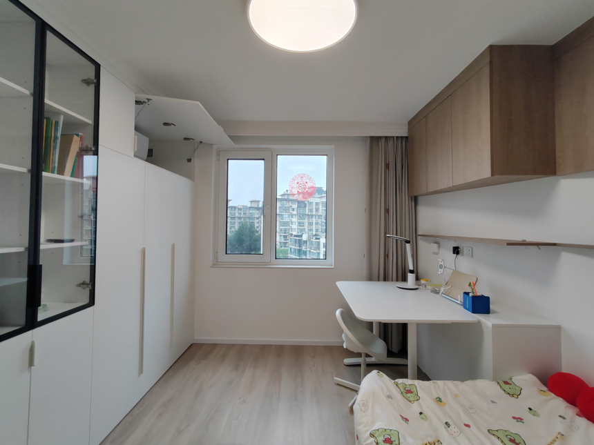 小臥室放置單人床,利用地柜增減臺(tái)面寬度,吊柜方便拿取,儲(chǔ)物,整面墻做柜子衣物、被子收納空間十足。